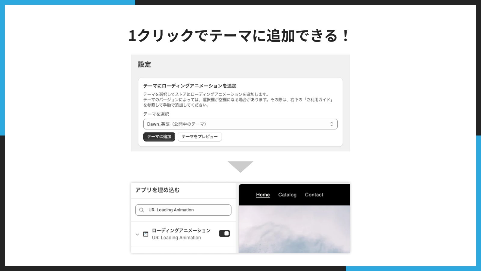 1クリックでテーマに追加できる操作性を追求しているのも大きなポイントです。面倒な手順や複雑な設定を行う必要はなく、アプリをインストールしてワンクリックでテーマに追加すれば、すぐにローディングアニメーションの導入が完了します。余計な時間やコストをかけずに、スピーディにアップデートできるのが魅力です。