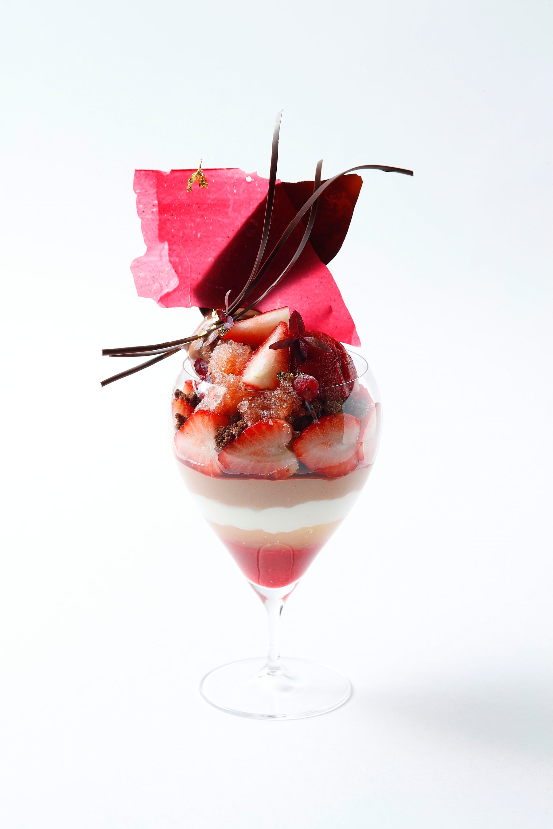 ペスがパフェ全体を包み、ザクザクとしたチョコクランブルで軽快な食感をもたせました。パフェの周囲をぐるりと彩るフレッシュな瑞々しい苺となめらかなチョコレートクリームに続くのは、さっぱりとしたフラン