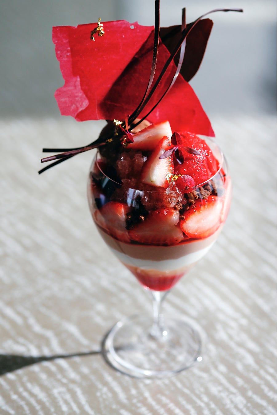 からパフェはスタート。フレッシュな苺とフランボワーズ、赤すぐりがほどよい酸味を添えます。