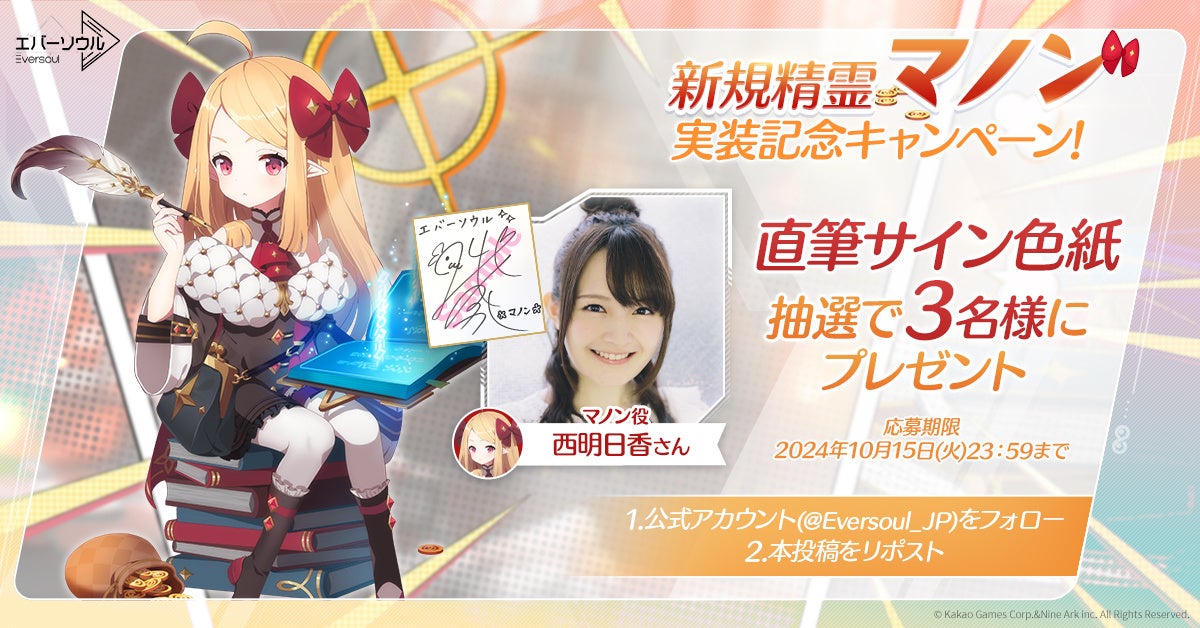 新規精霊「マノン」の実装を記念して2024年10月2日(水)より「フォロー&リポストキャンペーン」を実施中です。『エバーソウル』公式X(旧Twitter)をフォローした状態で、該当キャンペーンポストをリポストした方の中から「マノン」役を演じた「声優:西明日香さん」の直筆サイン色紙を抽選で3名様にプレゼントします!