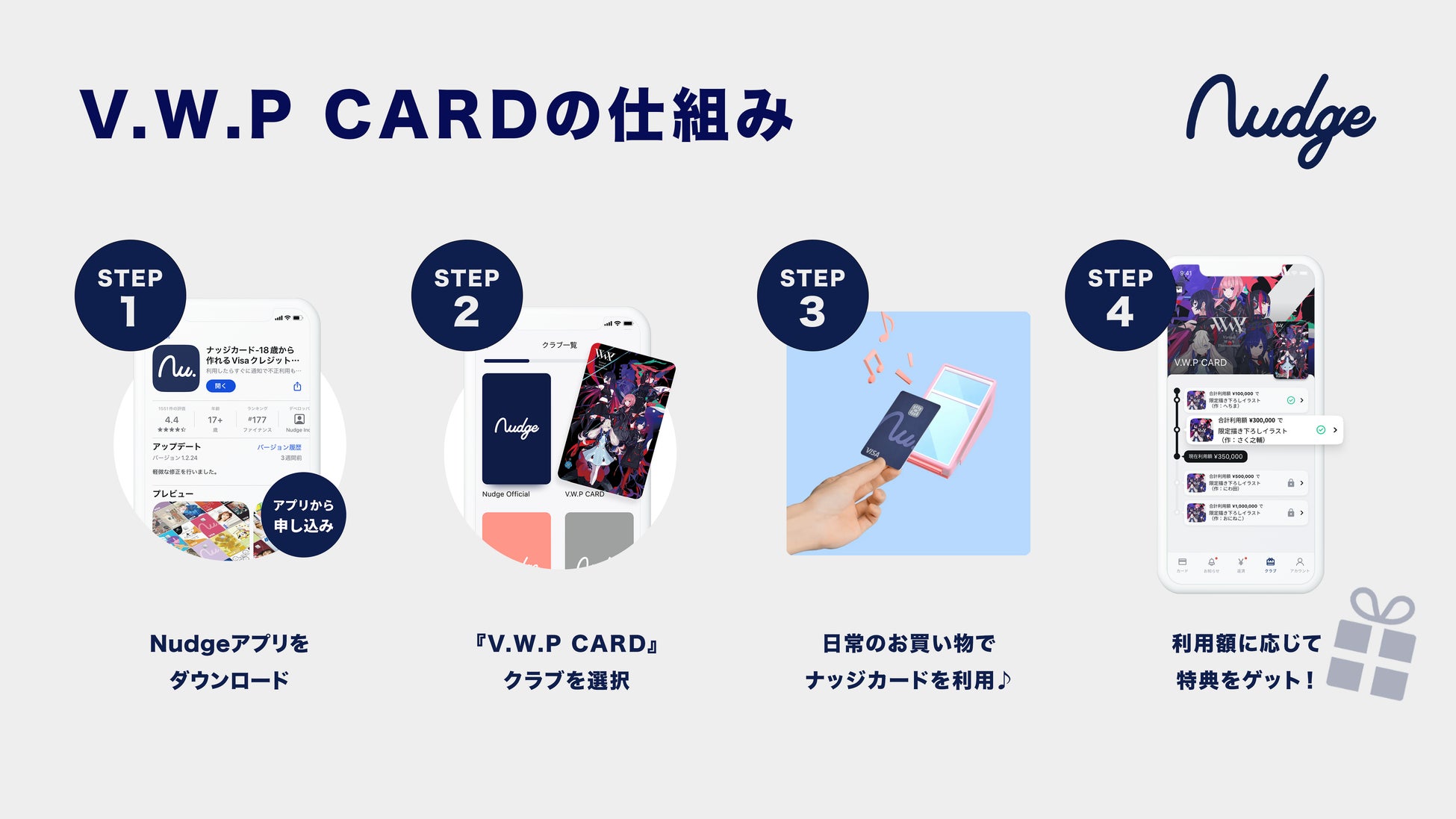 「V.W.P CARD」は、ナッジアプリからV.W.P CARDクラブに入会することで、5人組バーチャルアーティストグループ「V.W.P」の活動を応援できるナンバーレス型のタッチレス決済対応クレジットカードです。年会費・入会金は無料で、カード利用額の一部が「V.W.P」のアーティスト活動支援に充てられるだけでなく、利用額に応じた特典として、限定描き下ろしイラストを受け取ることができます。また、クラブ限定で、V.W.Pのメンバー一人一人の姿が券面に大きく描かれたオリジナルデザイン(全5種)や全員集合版の合計6種類のオリジナルデザインカードの発行が可能(※3)で、ファンにとって非常に魅力的なアイテムとなっています。