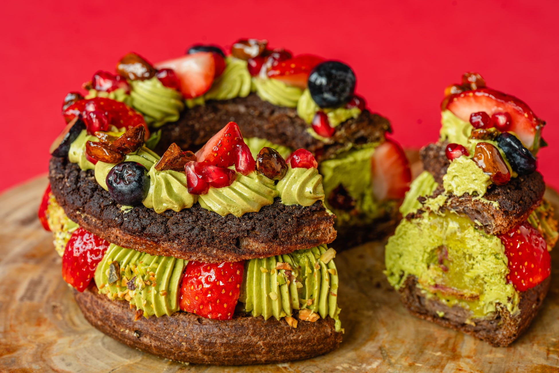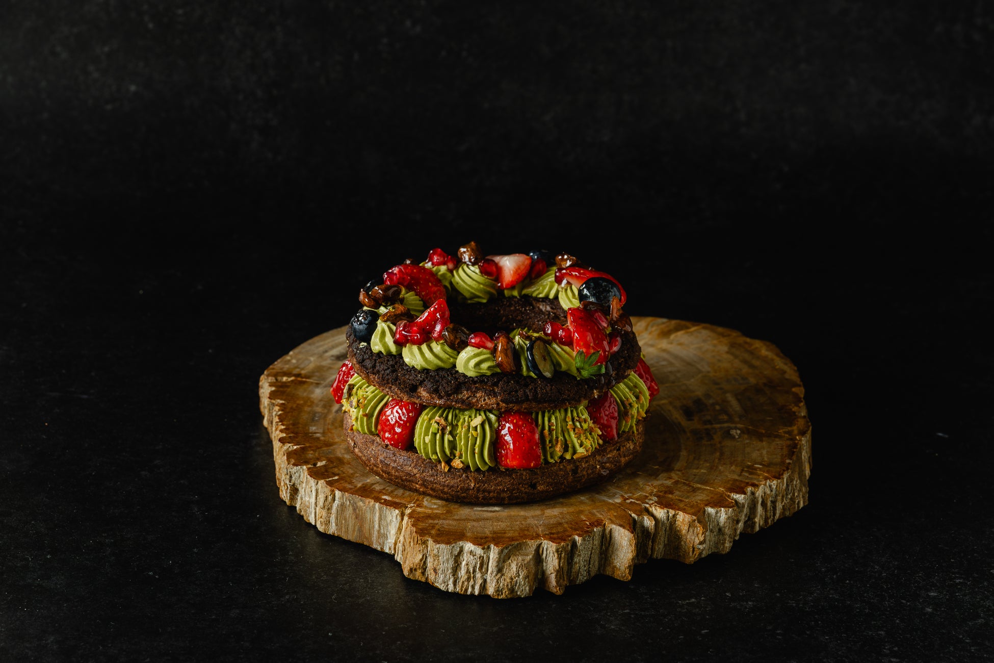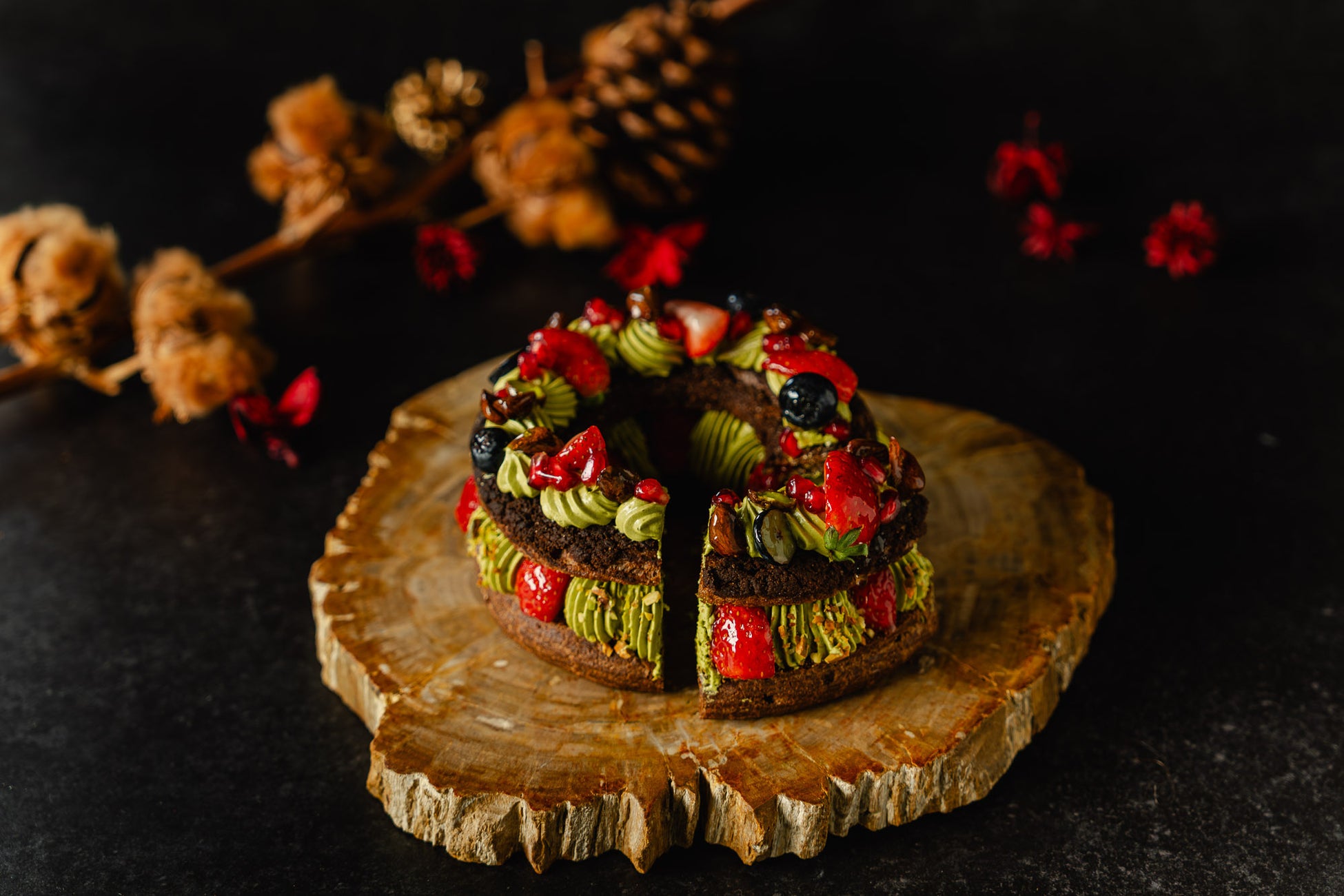 今年のクリスマスに向けてご用意したのが、クリスマスリースをイメージした限定パリ・ブレスト『ノエルTAKANAWAブレスト』。ココアを練り込んだシュー生地に、イタリア発「BABBI」のピスタチオペーストを贅沢に使用した濃厚なピスタチオクリームと、軽やかに仕立てたバタークリームの2種類のクリームを重ね、深みのある味わいに仕上げました。アクセントにはほんのり酸味のあるグリオットチェリーのソースを忍ばせ、栃木県産いちごなど、フルーツをたっぷり合わせています。