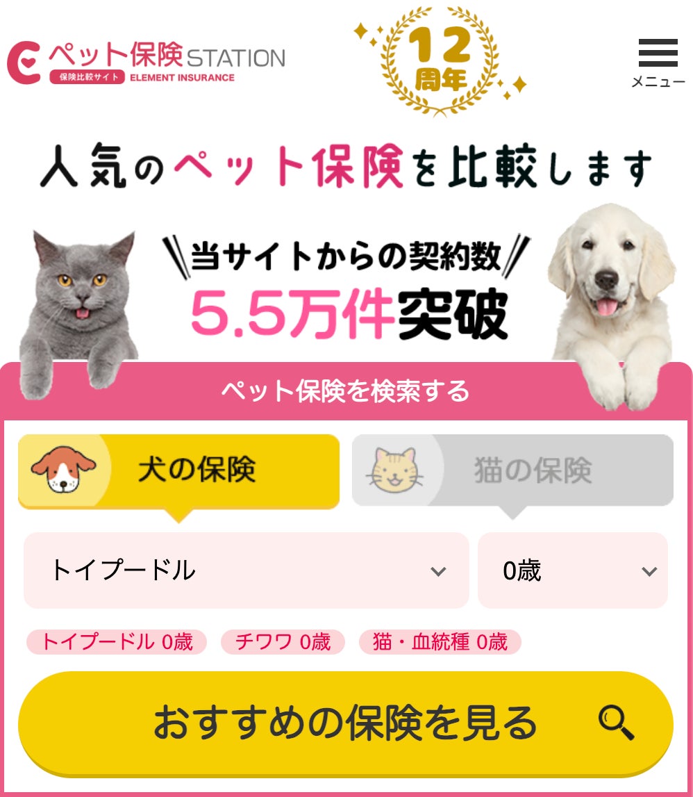 当社は、人気ペット保険12社の中から「種類・年齢」をもとに保険料や補償内容を比較できる機能をはじめ、高齢ペット向け・多頭飼育向けの条件別比較や、30秒で自分に合ったペット保険を絞り込みできるシミュレーション機能をご案内しています。見積もりから申し込みまで、インターネットで完結するため便利にご利用頂けます。
