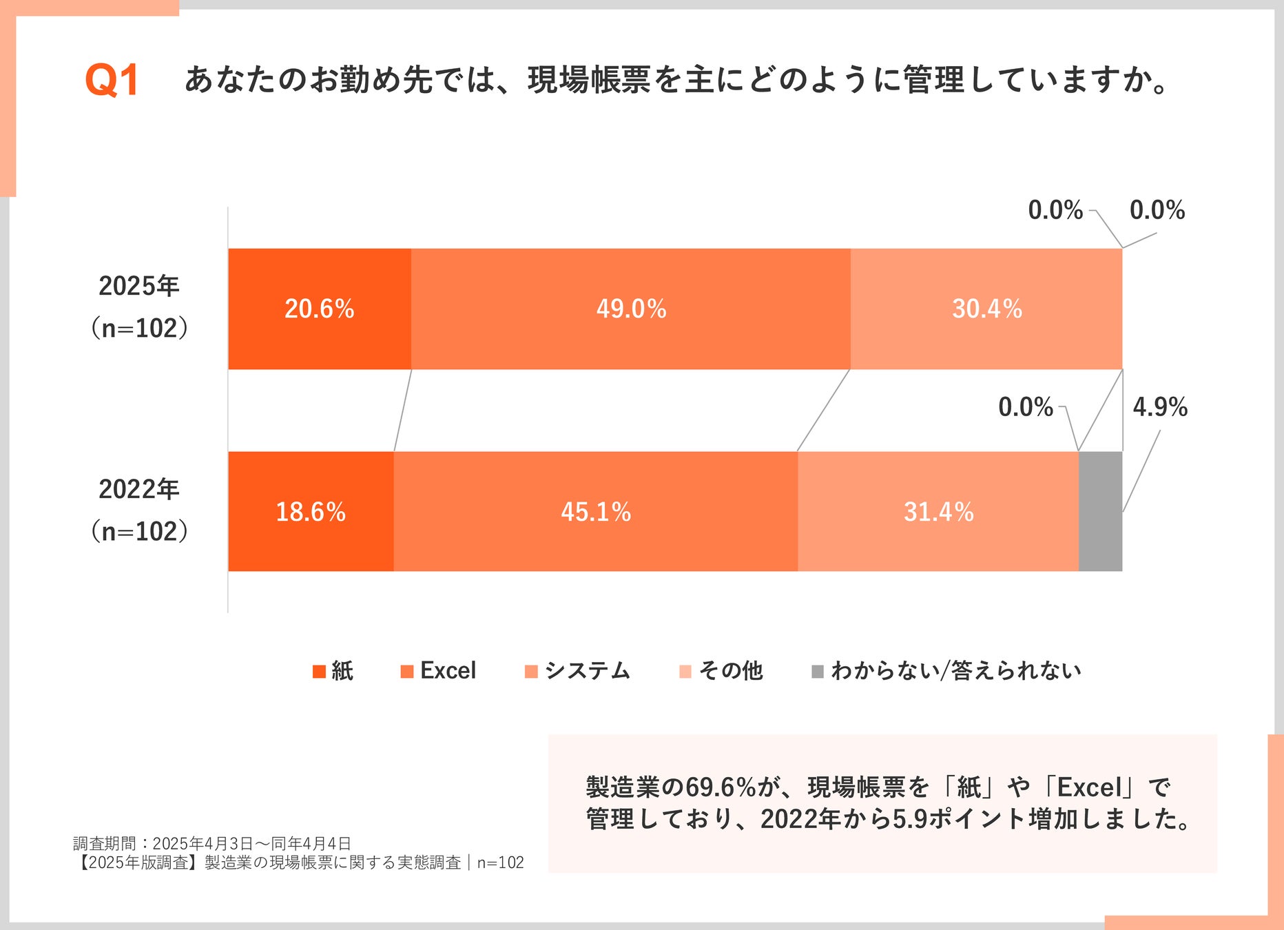 【2025年版調査】製造業の現場帳票に関する実態調査では、現場帳票を紙・Excelで管理している企業が依然として多数派であることが明らかになりました。その割合は全体の69.6%。3年前の63.7%からむしろ後退しています。(5.9ポイント上昇)