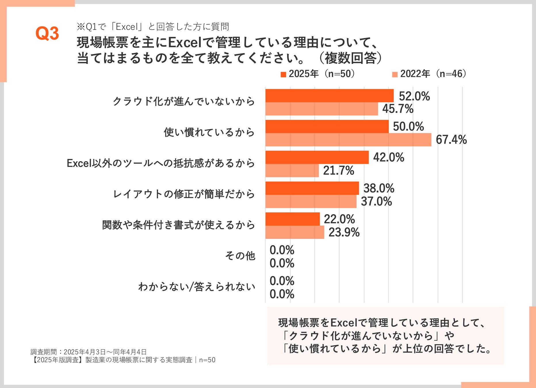 調査(【2025年版調査】製造業の現場帳票に関する実態調査)によると、紙管理継続の理由として最も多かったのは「紙の方が利便性が高い」(42.9%)という声です。Excelについても「クラウド化が進んでいない」(52.0%)、「使い慣れている」(50.0%)といった声が並びました。つまり、導入されたデジタルツールが、現場での運用設計を伴っていないがゆえに、利便性や慣習に負けているのです。