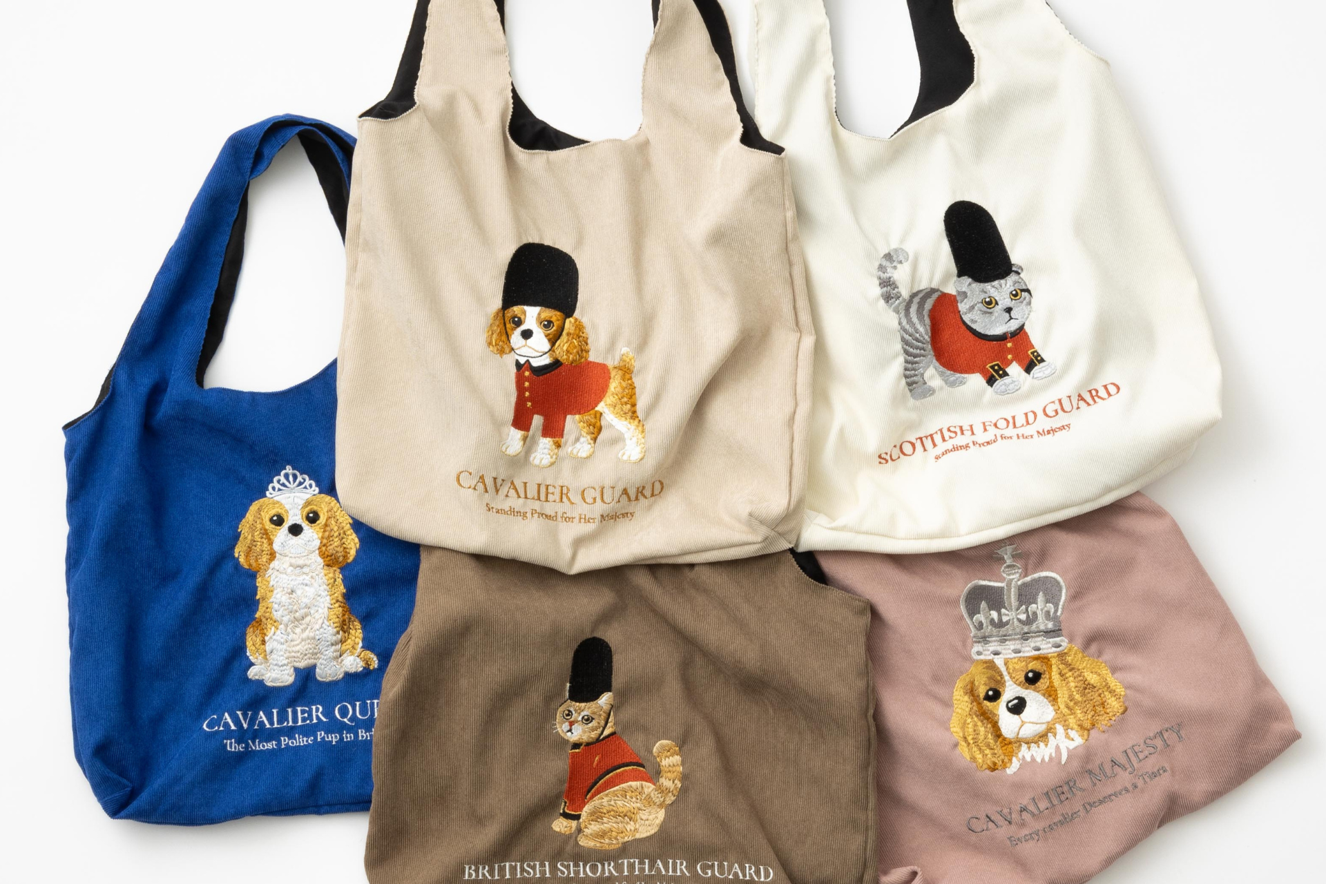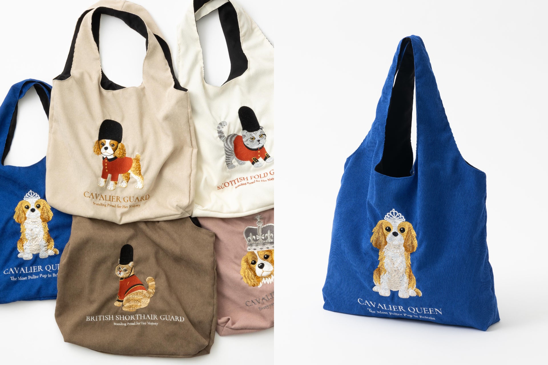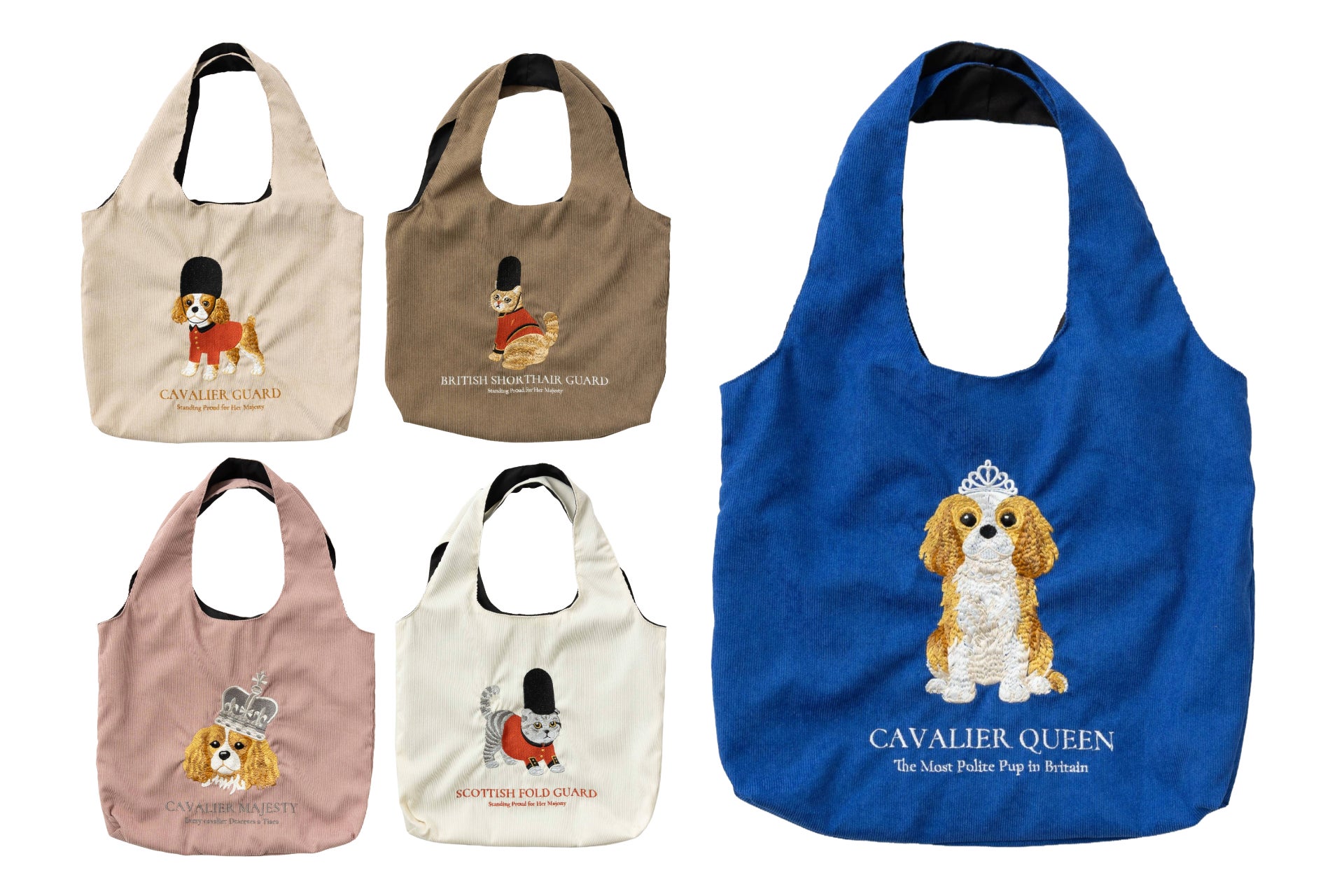 【英国モチーフ×刺繡】雑貨ブランド「Jubilee」から、近衛兵や女王に扮した犬&猫デザインの立体刺繡バッグが新登場