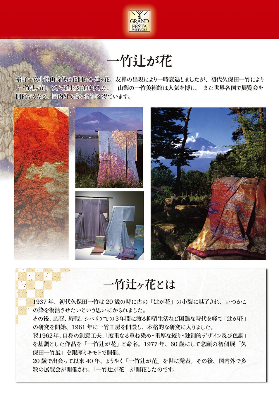 室町~安土桃山時代に花開いた辻が花。友禅の出現により一時衰退しましたが、初代久保田一竹により「一竹辻が花」として進化を遂げました。山梨の一竹美術館は人気を博し、また世界各国で展示会を開催するなど、国内外で高い評価を得ています。