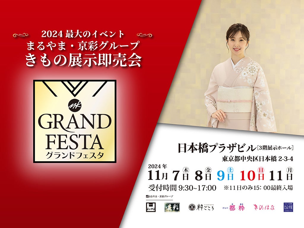 まるやま・京彩グループ(本社:神奈川県川崎市)は11月7日(木)から11日(月)の5日間、きもの展示即売会「グランドフェスタ」を開催いたします。各線日本橋駅から徒歩1分の日本橋プラザビル3階の展示ホールで実施します。