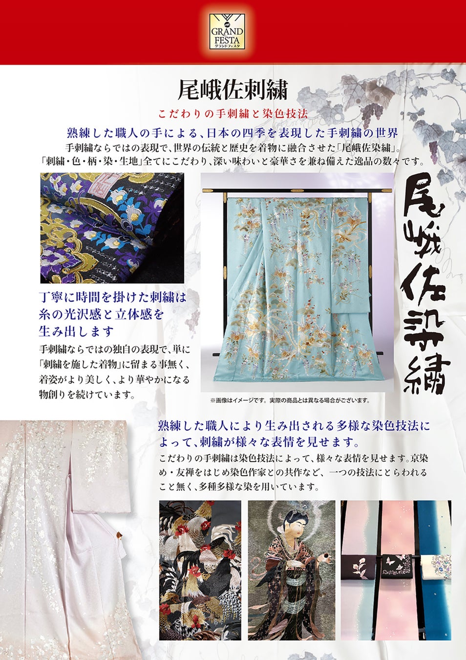 手刺繍ならではの表現で、世界の伝統と歴史を着物に融合させた「尾峨佐染繍」。「刺繍・色・柄・染・生地」全てにこだわり、深い味わいと豪華さを兼ね備えた逸品の数々です。丁寧に時間を掛けた刺繍は糸の光沢感と立体感を生み出します。