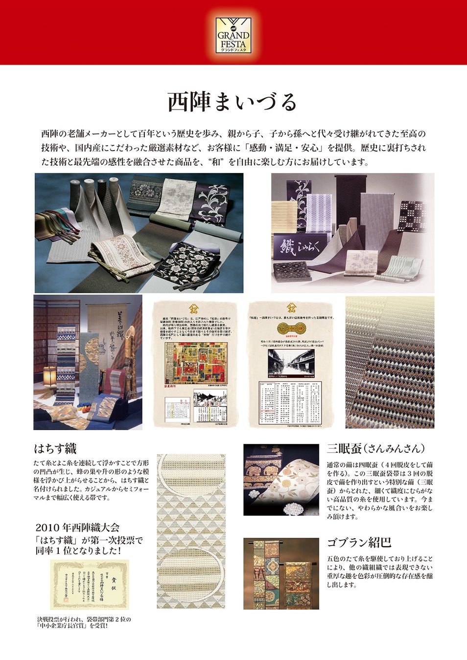 西陣の老舗メーカーとして百年という歴史を歩み、親から子、子から孫へと代々受け継がれてきた至高の技術や、国内産にこだわった厳選素材など、お客様に「感動・満足・安心」をご提案します。"和"を自由に楽しむ方に、歴史に裏打ちされた技術と最先端の感性を融合させた商品をお届けしています。