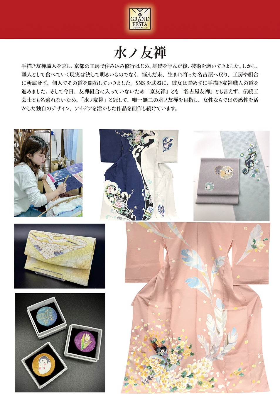 京都の工房で手描き友禅の基礎を学び、技術を磨く。その後名古屋へ戻り、工房や組合に所属せず個人でその道を開拓していきました。「水ノ友禅」と冠して、唯一無二の水ノ友禅を目指し、女性ならではの感性を独自のデザイン・アイデアに活かし作品を創作し続けています。