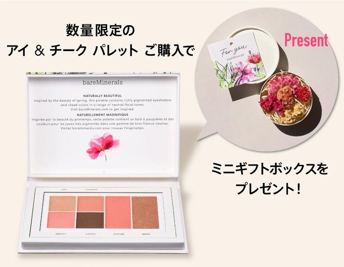 【ベアミネラル】フラワーロス ミニギフトプレゼント。本日4月3日発売「アイ & チーク パレット ナチュラリー ビューティフル」をベアミネラル公式 楽天市場店とカウンター(3店舗限定 )でご購入で