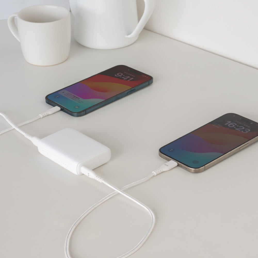 丸みを帯びたフォルムが特徴の、片手で持てるサイズのモバイルバッテリーです。USB Type-Cポートは最大PD30Wの入出力に対応し、USB Type-Aポートと合わせて使うことで2台同時充電ができます。