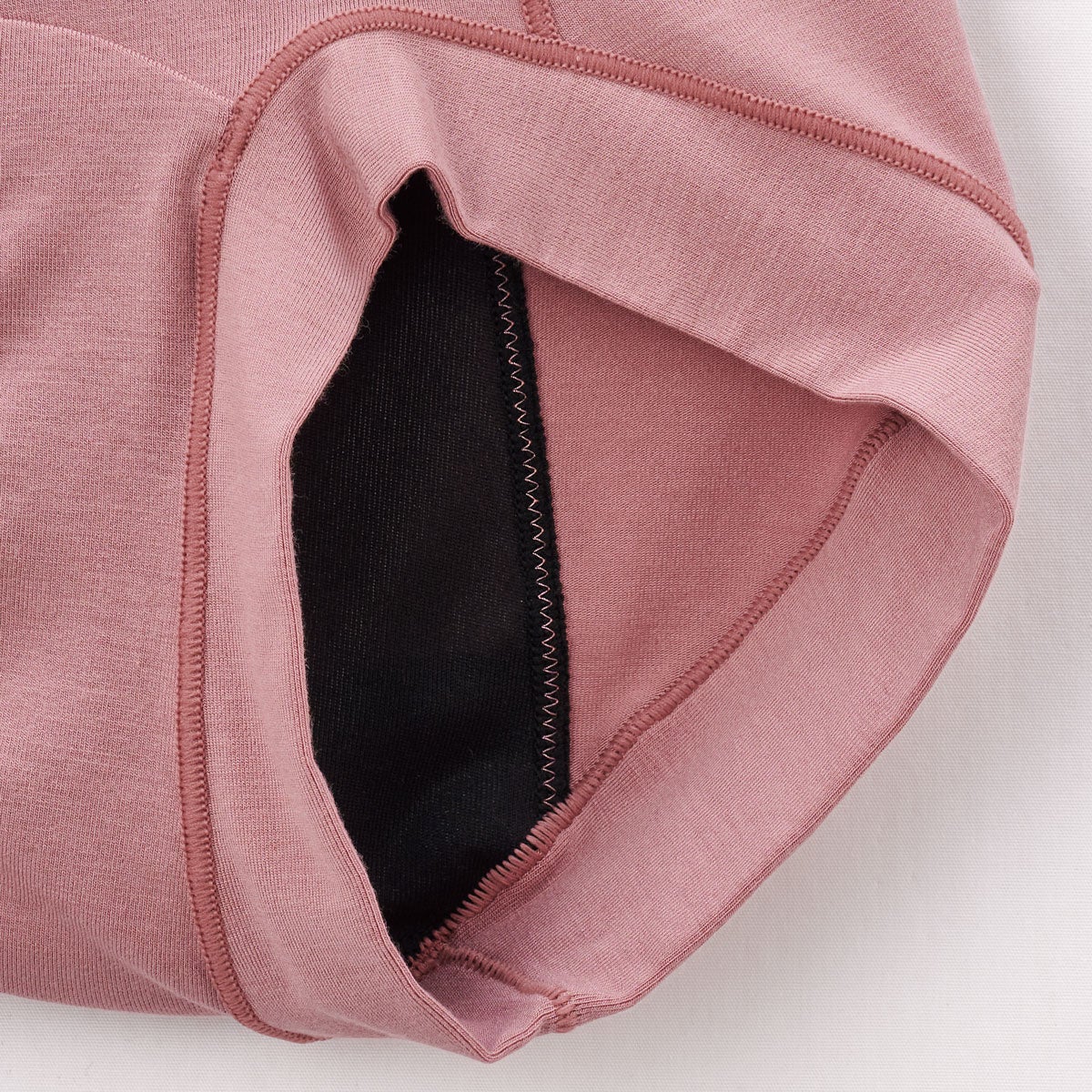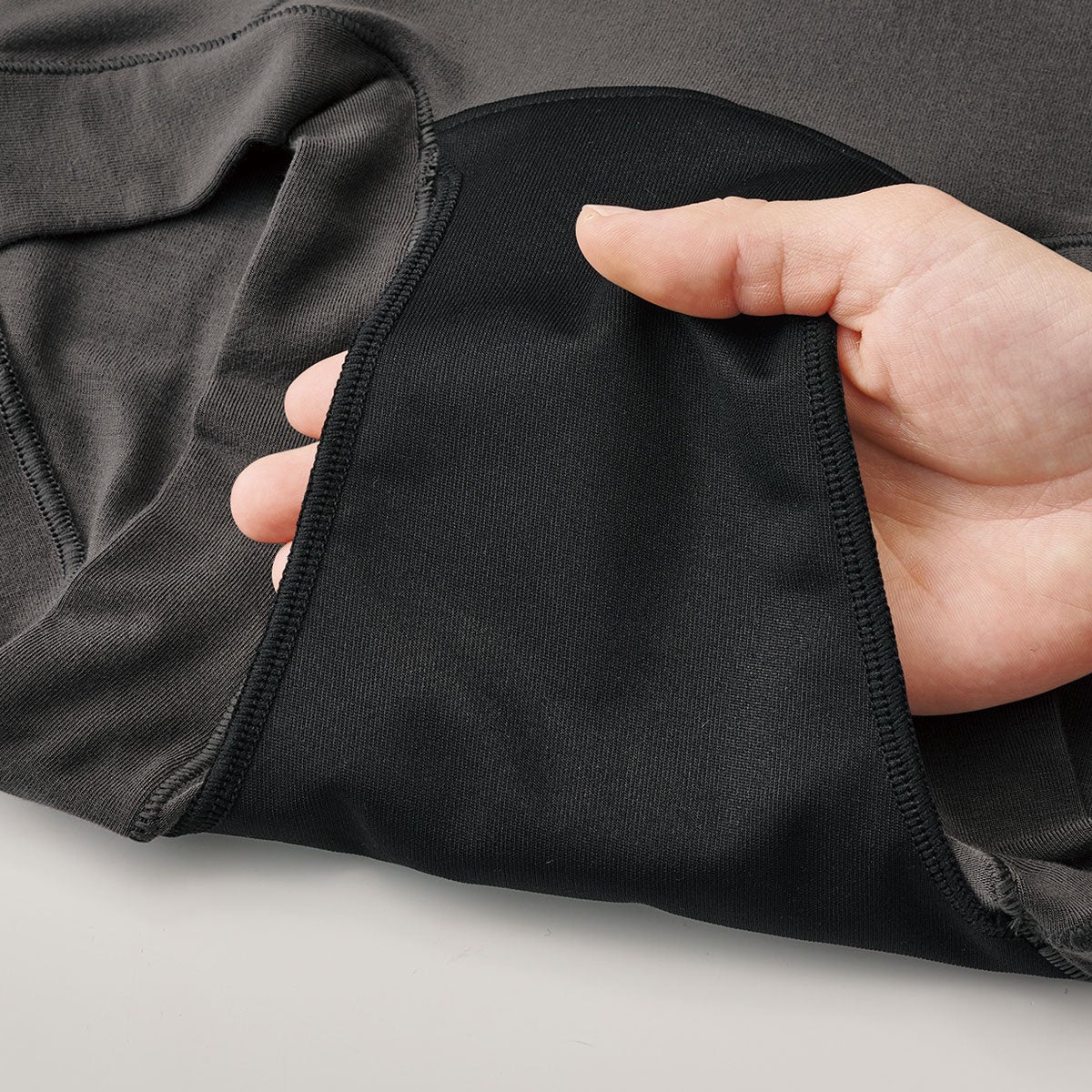 ウエスト・足口はゴムを使わない生地折り返しでくい込みにくい。縫い代は表側で、肌に負担を感じにくい。