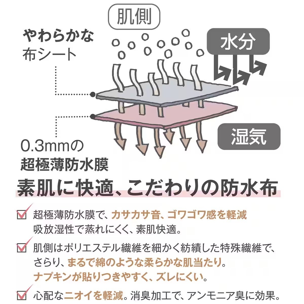 安心感にもしっかりこだわり、長時間の座り仕事や就寝時に伝い漏れがしにくい、後ろに長い防水布と、ナプキンが体にフィットするセンターギャザーを採用しました。防水布はセシールオリジナルの日本製で、綿のような柔らかな肌当たりと、超極薄防水膜でムレにくく、カサカサ音も軽減。ナプキンが貼りつきやすいからズレの不快感やトラブルも軽減します。尿漏れのお悩みの方に、吸水シートとの使用も最適。