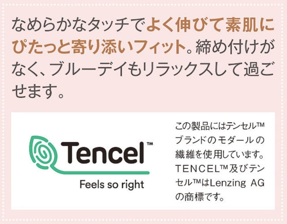 なめらかなとろみ感触でよく伸びて締め付けにくい、テンセル™のモダール混素材を使用しているので着心地が良く、ウエスト・足口は身生地の折り返しによるやさしく寄り添うフィット感で、通常のショーツのゴムやレースのくい込みや肌当たりの不快感を解決。縫い代は表側にしたフラット縫製で肌当たりの良さもポイントです。