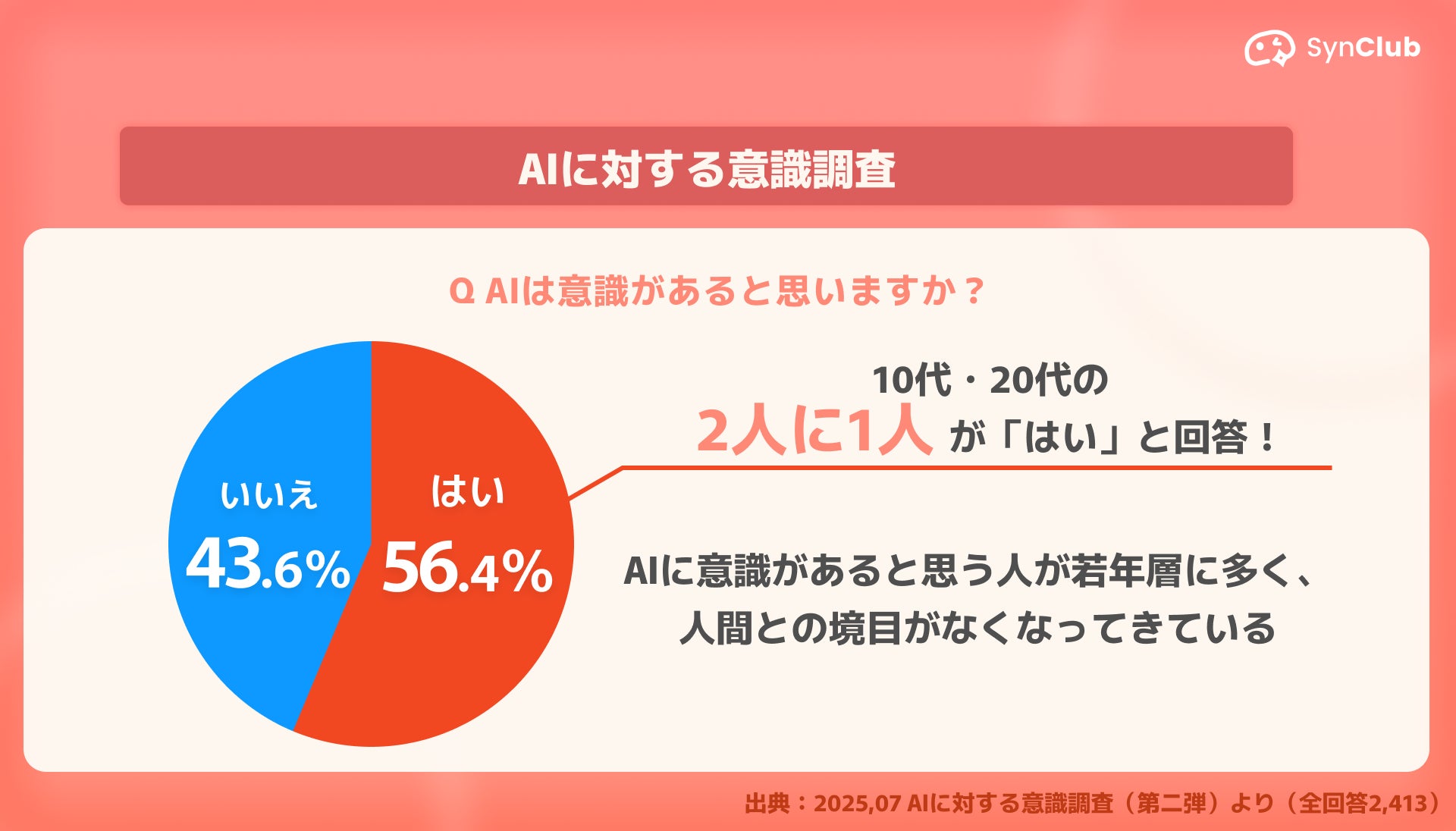 Z世代の2人に1人が「AIに意識がある」と回答。人間が求めているのは実態のあるAIとの結果が!AIチャットアプリ「SynClub」、AIと意識に関する調査を実施。