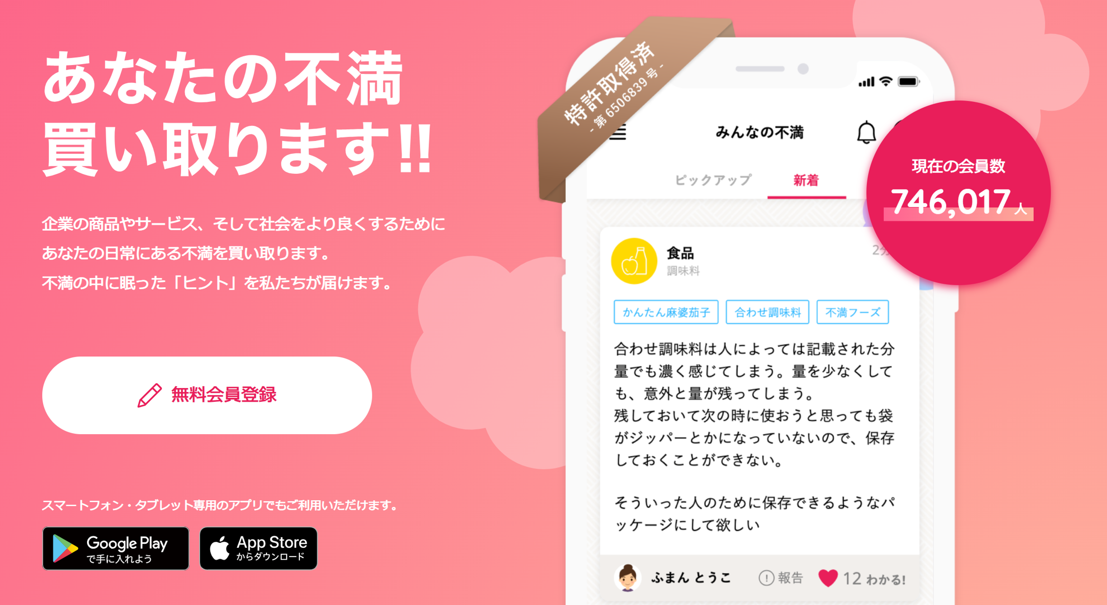 不満買取センターは、「企業の商品やサービス、そして社会をより良くするために、あなたの不満を買い取ります。あなたの不満の中に眠った”ヒント”を私たちが企業や社会に届けます」をコンセプトに、2015年3月18日からサービス開始をしております。Webサービス及びスマートフォンアプリを通して生活者からの不満の声を収集しており、現在累計74万人以上の会員から、累計4,500万件以上の不満を買い取っています。
