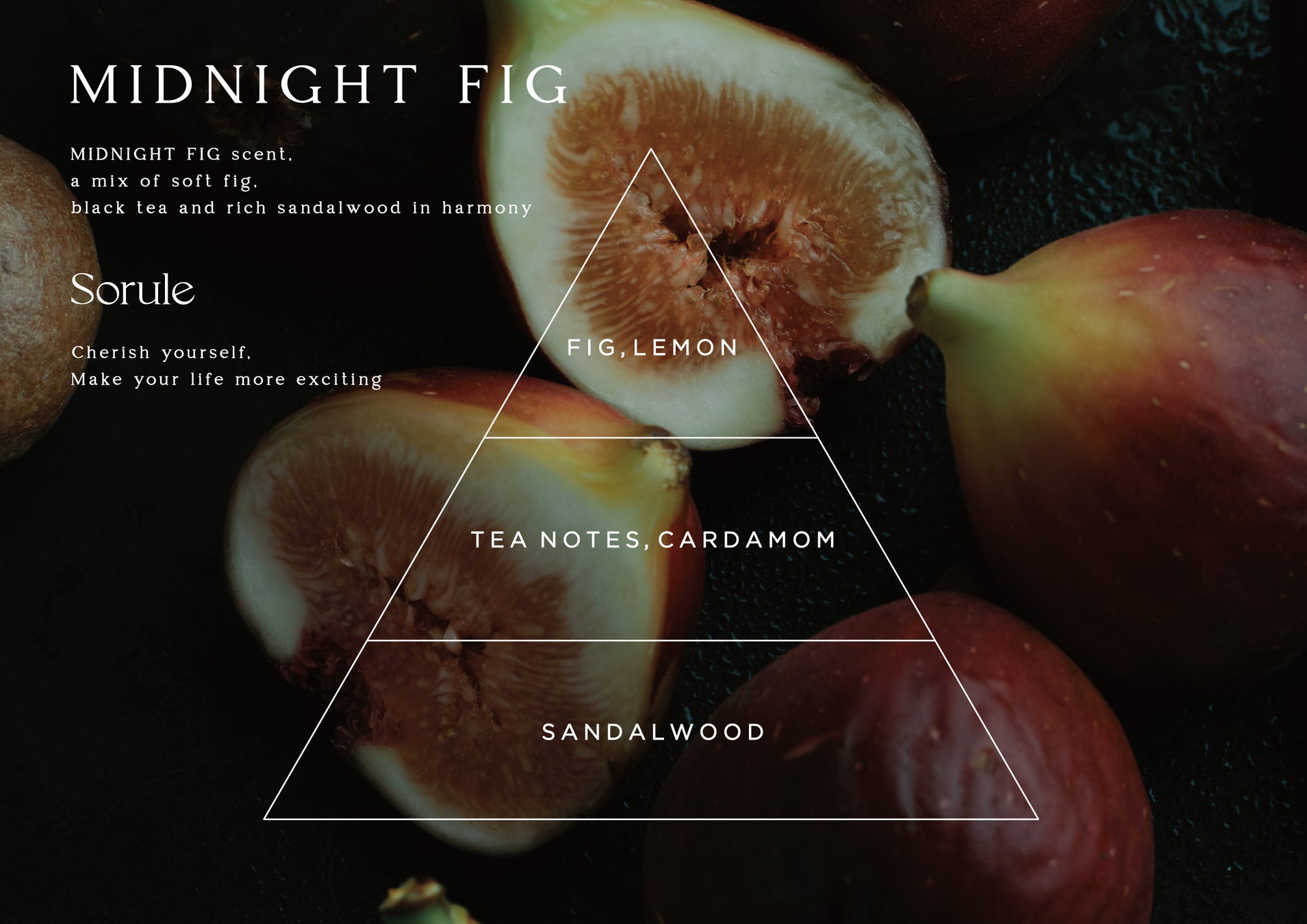 香りは「ソルレ」のヘアケアライン共通の「ミッドナイトフィグの香り」。やわらかなフィグと紅茶に重厚なサンダルウッドが調和したウッディフルーティの上品な香りをお楽しみください。