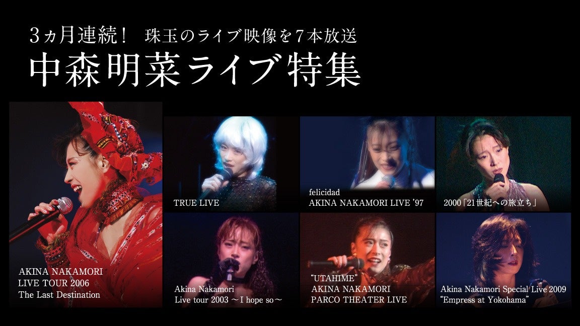 1982年のデビュー以来、今なお多くの人々の心を捉えて離さない歌姫、中森明菜。歌謡ポップスチャンネルでは「3カ月連続!中森明菜ライブ特集」と題し、1994年~2009年に開催されたライブ映像合計7本を、彼女の誕生日である7月13日(木)を皮切りに、3ヶ月連続で放送する。ポップス、バラード、カヴァーソングなど、変幻自在な表情を見せる彼女の世界をたっぷり堪能してほしい。