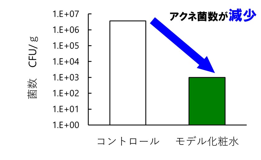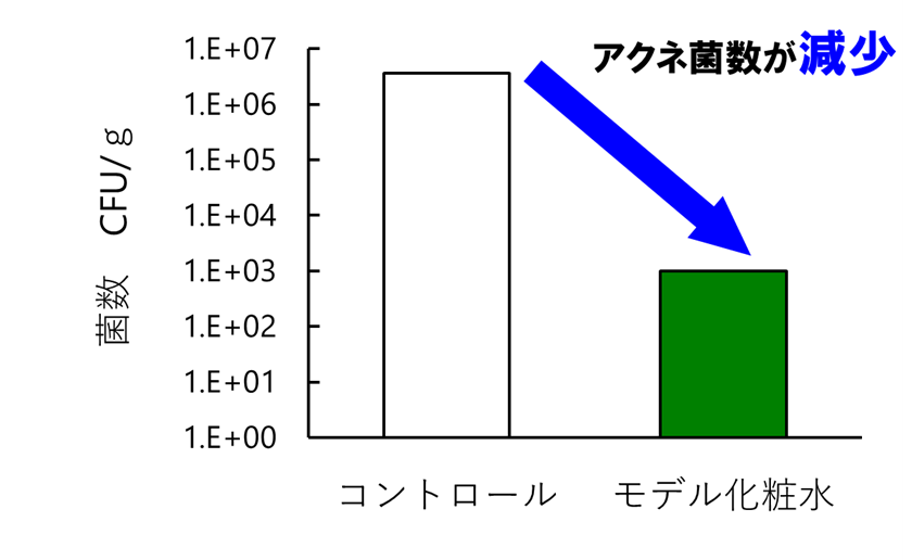 試験方法:アクネ菌を均一混合した疑似角栓をモデル化粧水に浸漬した後、アクネ菌の生菌数を測定した。