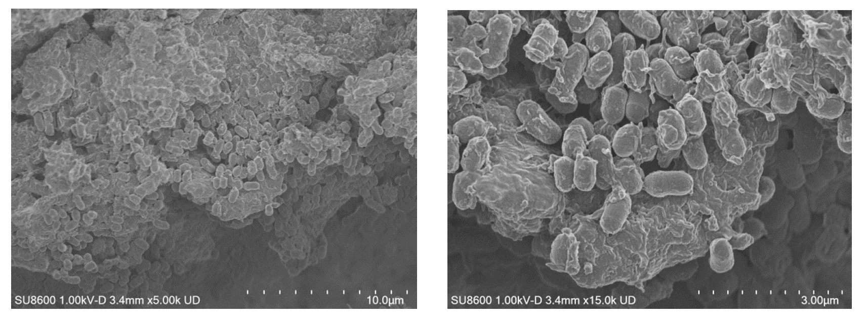 (左:角栓を5,000倍に拡大、右:角栓を15,000倍に拡大)