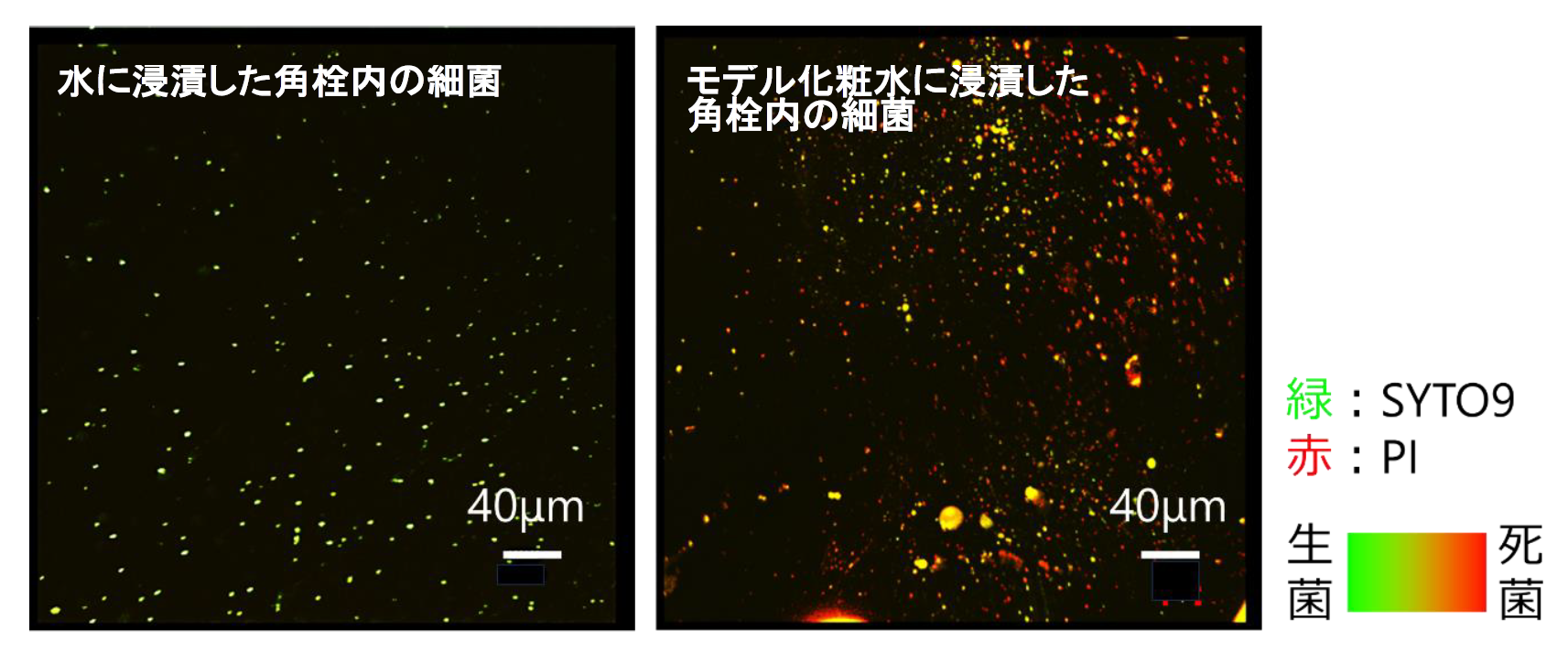 試験方法:採取した角栓をモデル化粧水に浸漬した後、角栓をLIVE/DEAD BacLight Bacterial Viability Kitを用いて染色し、共焦点レーザー顕微鏡にて観察を行った。