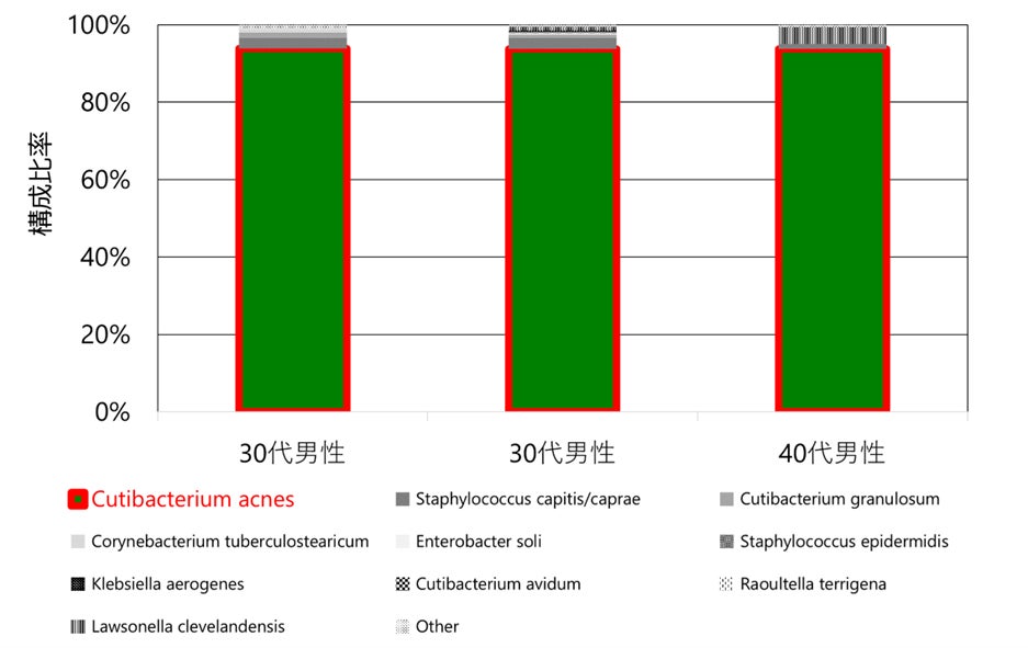 ニキビの原因の一つであるアクネ菌は、皮膚常在菌として皮膚上に存在している菌になり、ニキビができやすい人の皮膚上にも多く存在していることが知られています。今回、毛穴に詰まった角栓内にも細菌が存在し、ニキビができやすい人の角栓には細菌の構成比率としてアクネ菌が90%以上存在することを新たに発見いたしました(図1・図2)。