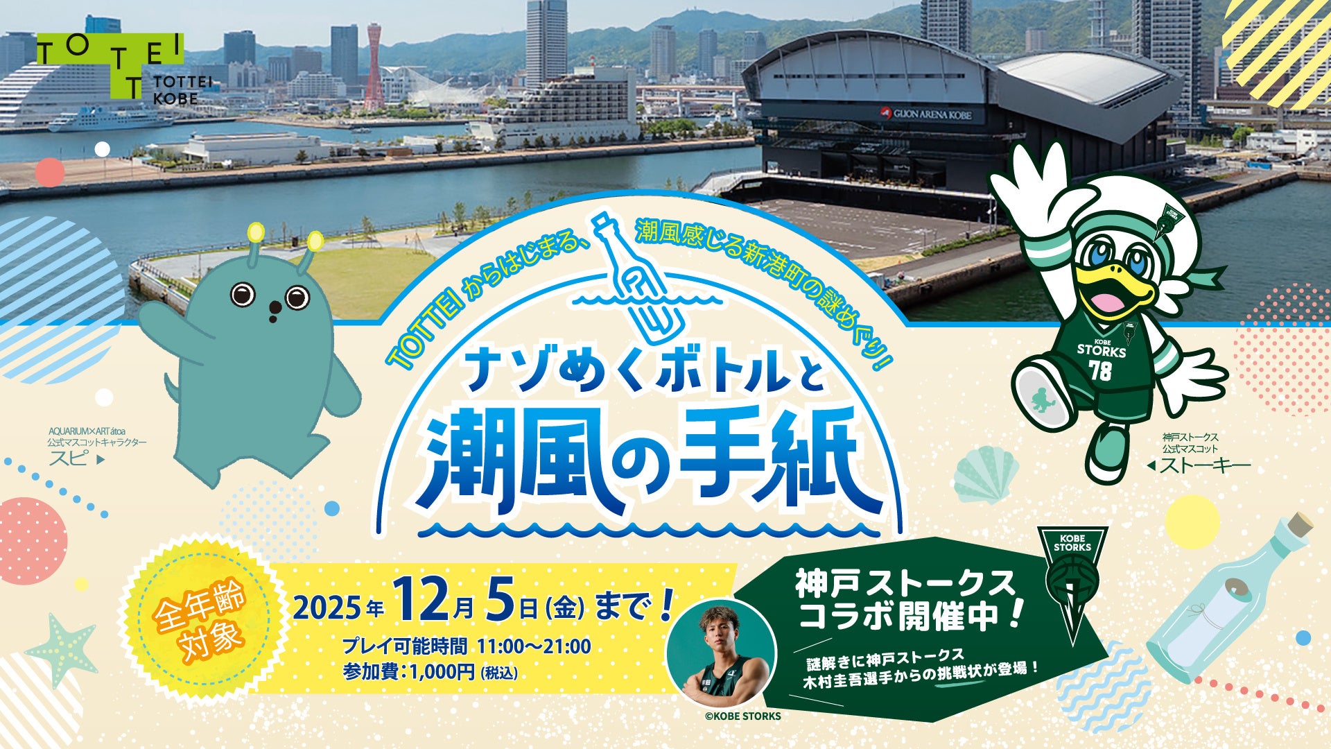 TOTTEIをスタート地点に、新港町の潮風を感じながら謎を解き進める体験型イベント「ストーキーとスピとめぐる『ナゾめくボトルと潮風の手紙』」が好評につき、12月5日(金)まで開催期間を延長!“神戸ストークス 木村圭吾選手の挑戦状”も引き続き挑戦可能です。
