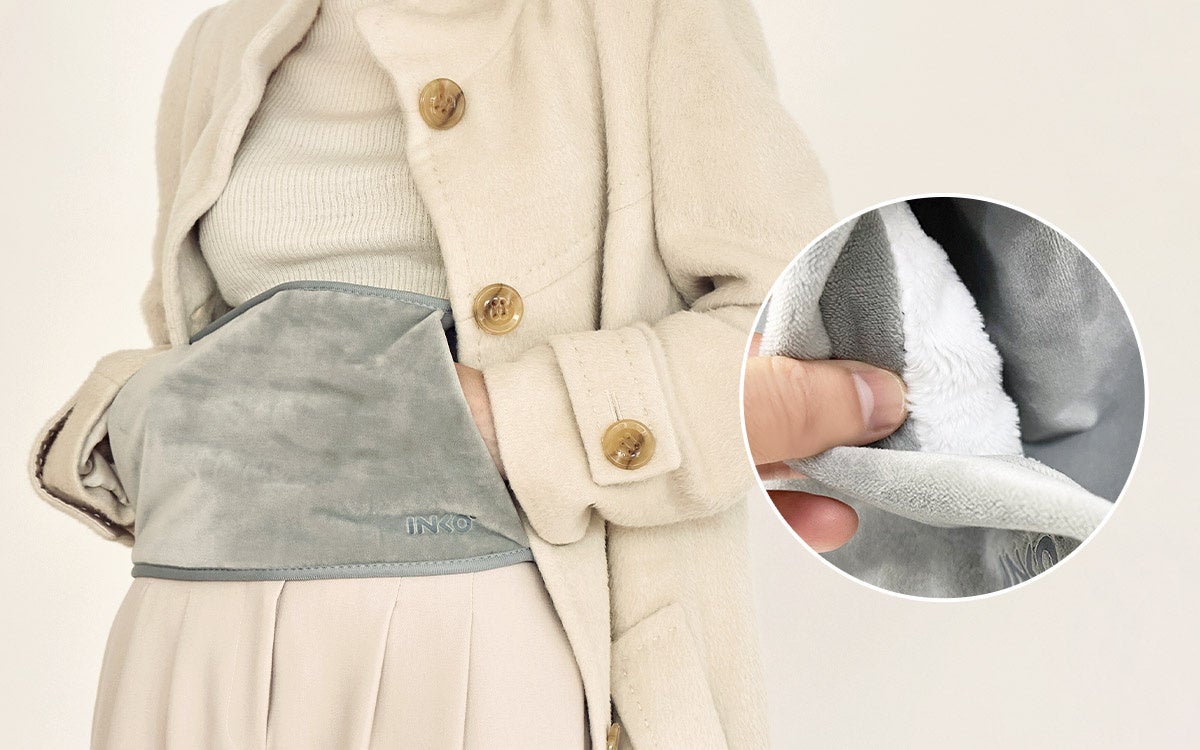 両手がすっぽり収まるほどの大きいポケットを腹巻きに設けました。INKOの表裏両面発熱の特性を活かし、ポケットの中はいつでもポカポカです。手全体から、指先までしっかりと温めます。ポケット内部には、毛布のようなふかふかの素材を使用し、素材自体の温かみを感じることもできます。