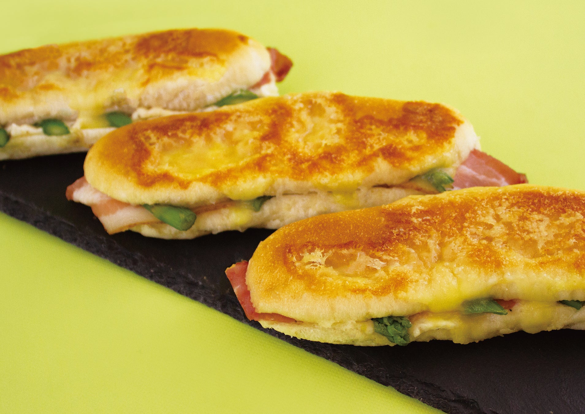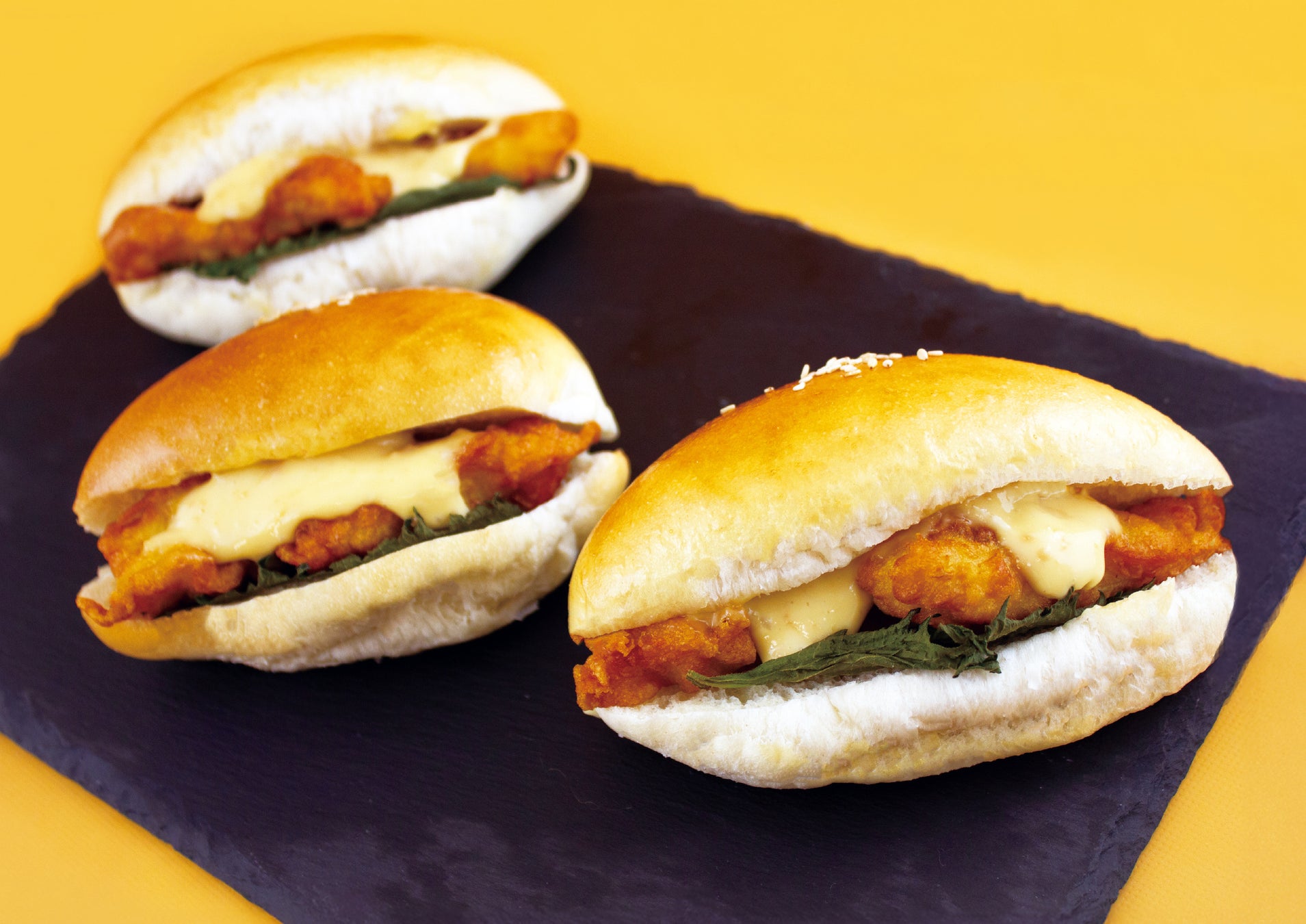シーザーサラダフィリングとベーコン、アスパラをサンドし焼き上げました。シーザーサラダフィリングはチーズとアンチョビのコクが香り、バンズと具材の美味しさを引き立てます。
