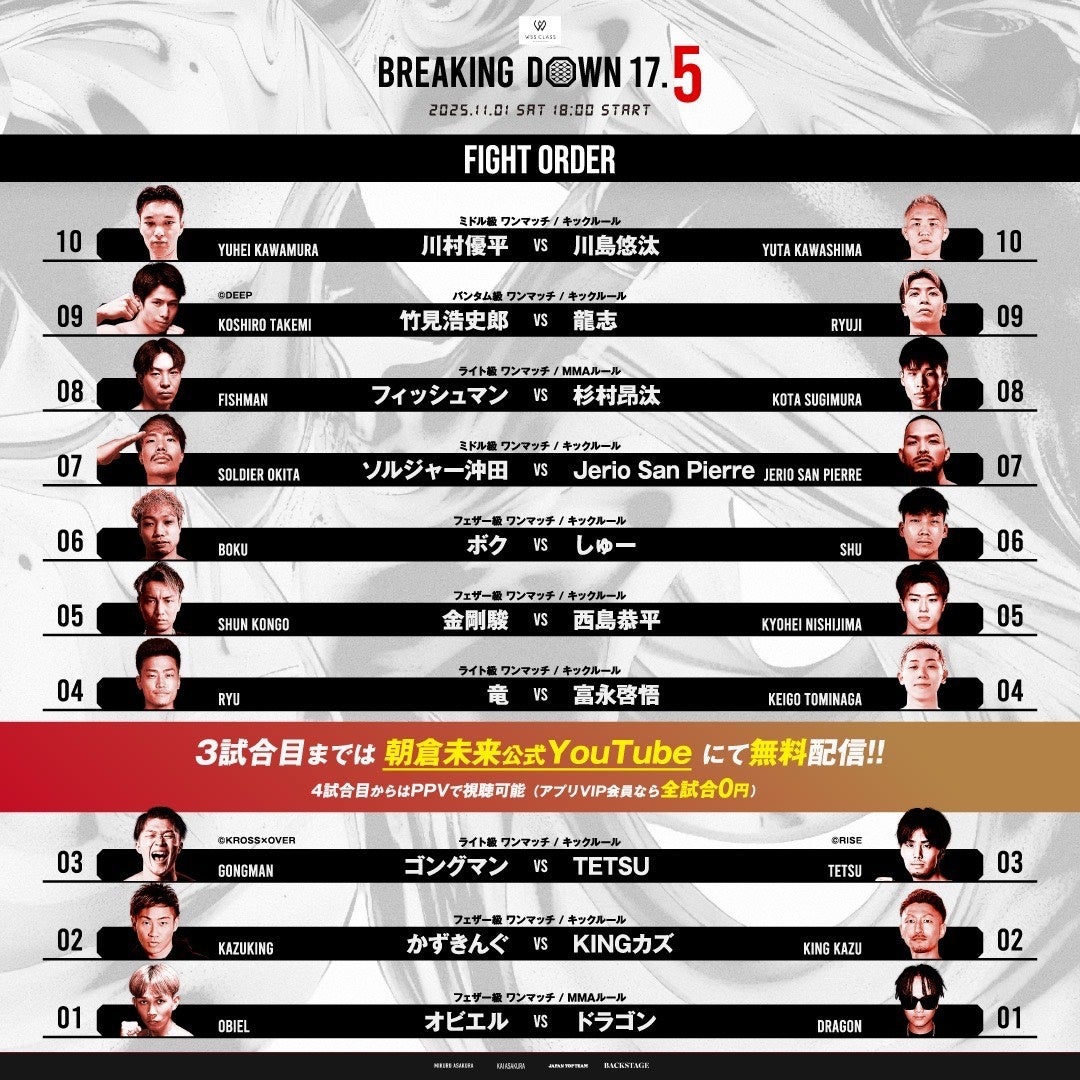 BreakingDown株式会社(本社:東京都港区、代表取締役:朝倉未来)は、2025年11月1日(土)に開催する格闘技イベント『WSS CLASS presents BreakingDown17.5』の全対戦カードを発表したことをお知らせいたします。