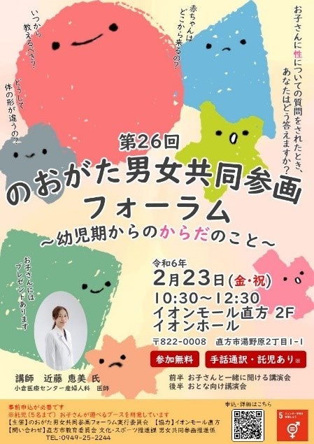 直方市男女共同参画推進係は、お子さんと一緒に性教育について学ぶことが出来る「第26回のおがた男女共同参画フォーラム」を2024年2月23日(金・祝)に開催致します。