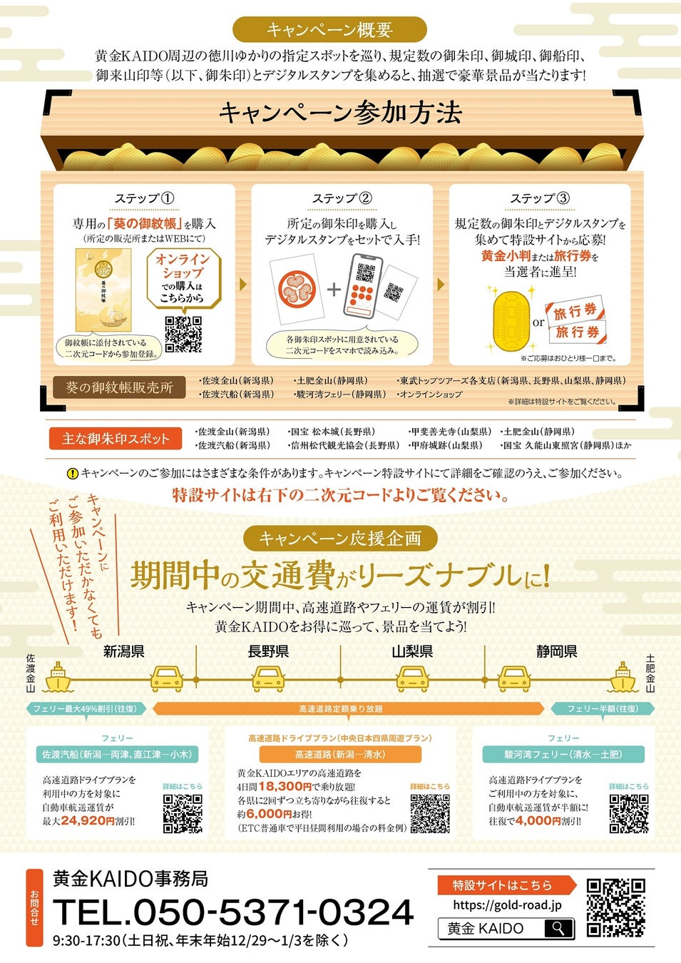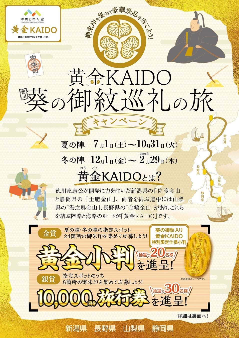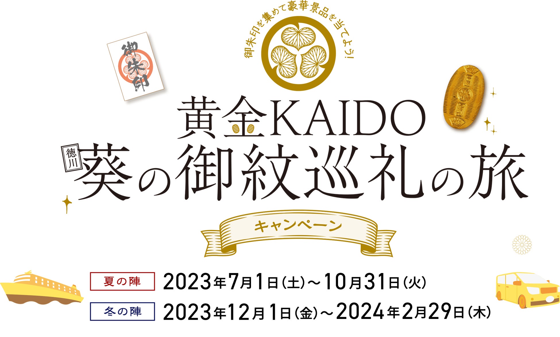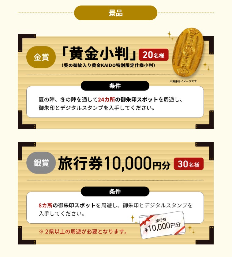 景品 | 〈金賞〉 夏の陣、冬の陣の指定スポット24箇所の御朱印を集めて応募 ・葵の御紋入り黄金KAIDO限定仕様の小判を抽選で20名様に進呈 〈銀賞〉 指定スポットのうち8箇所の御朱印を集めて応募 ・10,000円分の旅行券を抽選で30名様に進呈 |