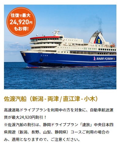 佐渡汽船 | ・自動車(6m未満往復)輸送運賃が最大24,920円割引の往復一律19,800円 |