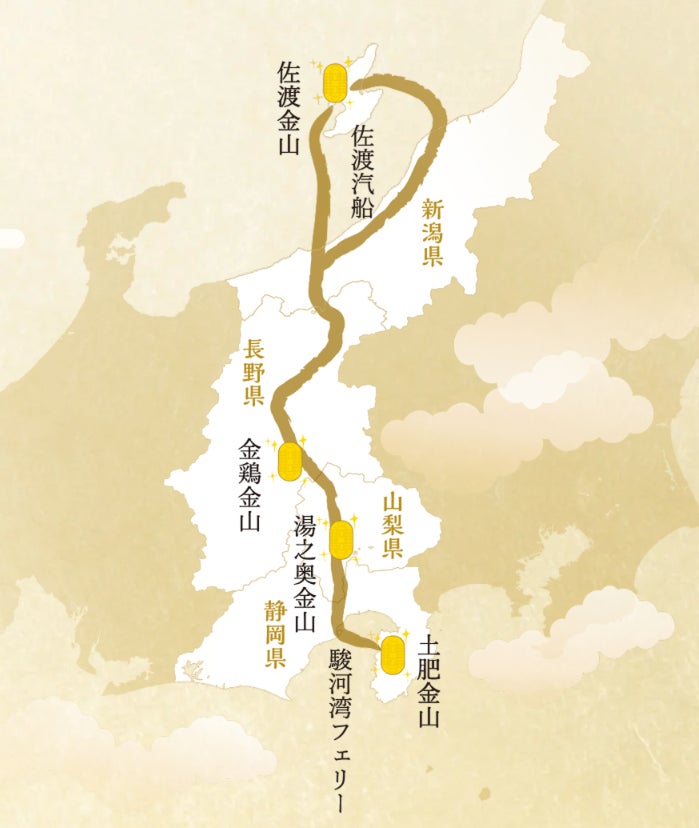 新潟県、長野県、山梨県、静岡県の中央日本4県は、「山の洲(やまのくに)」と称して観光や食などの分野で連携し、さまざまな取り組みを行っています。山の洲には、徳川家康公が開発に力を注いだ佐渡金山(新潟県)と土肥金山(静岡県)、両者を結ぶ道中には「湯之奥金山(山梨県)、「金鶏金山」(長野県)などがあり、これらを結ぶルートを「黄金KAIDO」と名付けました。