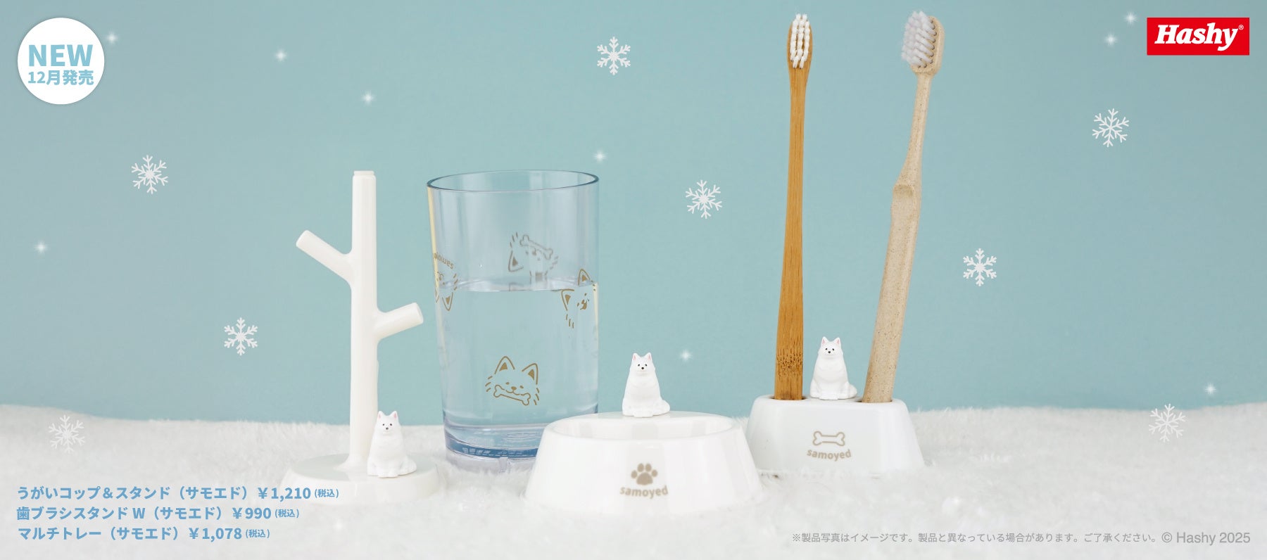 うがいコップ&スタンドと歯ブラシスタンドWと使えば、洗面台がサモエド一色に♪