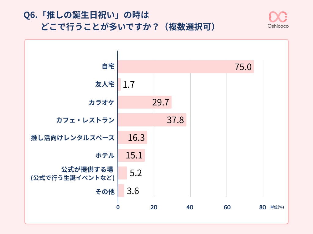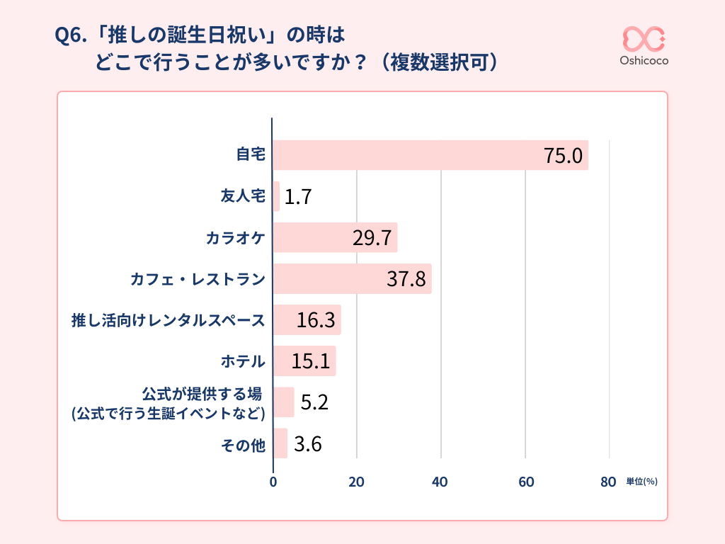 誰と過ごすかという問いに対しては「一人で祝う」が約66%でトップ、そして誕生日祝いを行う場所として最も多かったのは「自宅(75%)」という結果になりました。