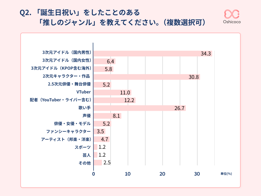 誕生日祝いをしたことのある推しのジャンルを複数回答で聞いたところ、「3次元アイドル(国内男性)」が34.3%でトップとなりました。次いで「2次元キャラクター・作品(30.8%)」「歌い手(26.7%)」と続き、この3ジャンルだけで全体の約9割を占めました。