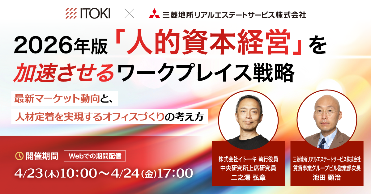 不動産総合コンサルティング会社の三菱地所リアルエステートサービス株式会社(本社:東京都千代田区)とオフィス家具メーカー株式会社イトーキ(本社:東京都中央区)は、4月23日~4月24日にWEBセミナー『2026年版「人的資本経営」を加速させるワークプレイス戦略 ― 最新マーケット動向と、人材定着を実現するオフィスづくりの考え方ー』を開催します。