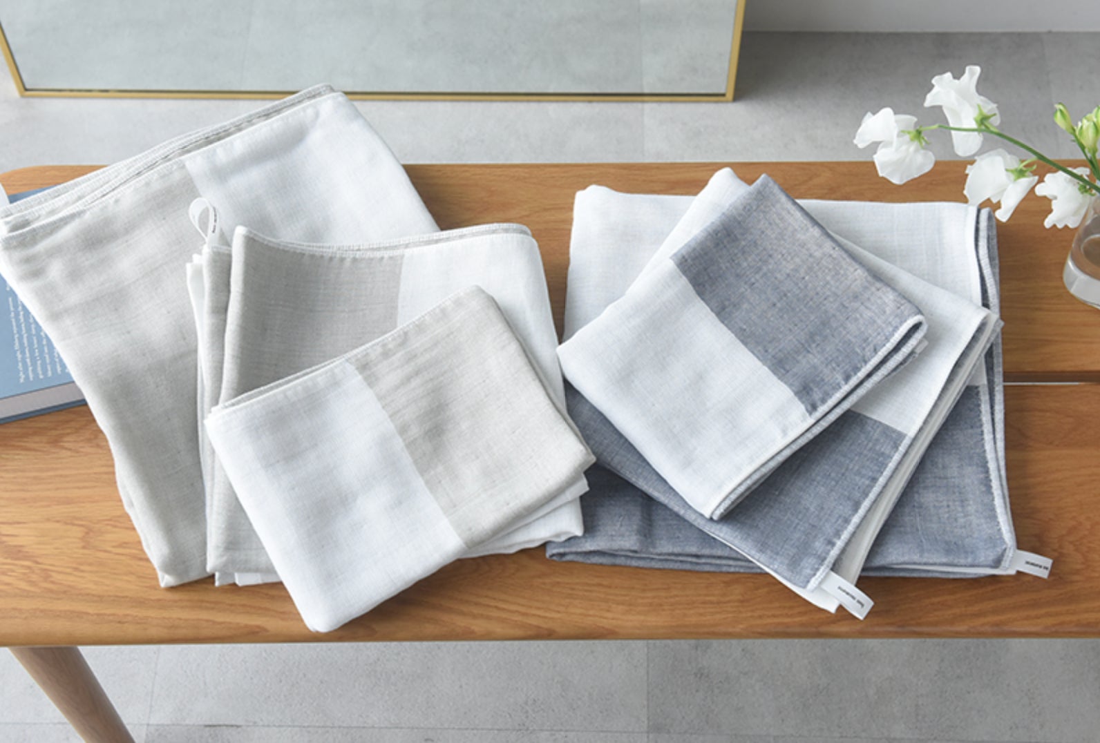 ガーゼならではの高い吸水力と乾きやすさ、収納時にかさばりにくい特徴を持った、ボンモマンの「かさばらないタオル」シリーズ。リピーターも多い人気タオルに、2つのバイカラーが新登場です。