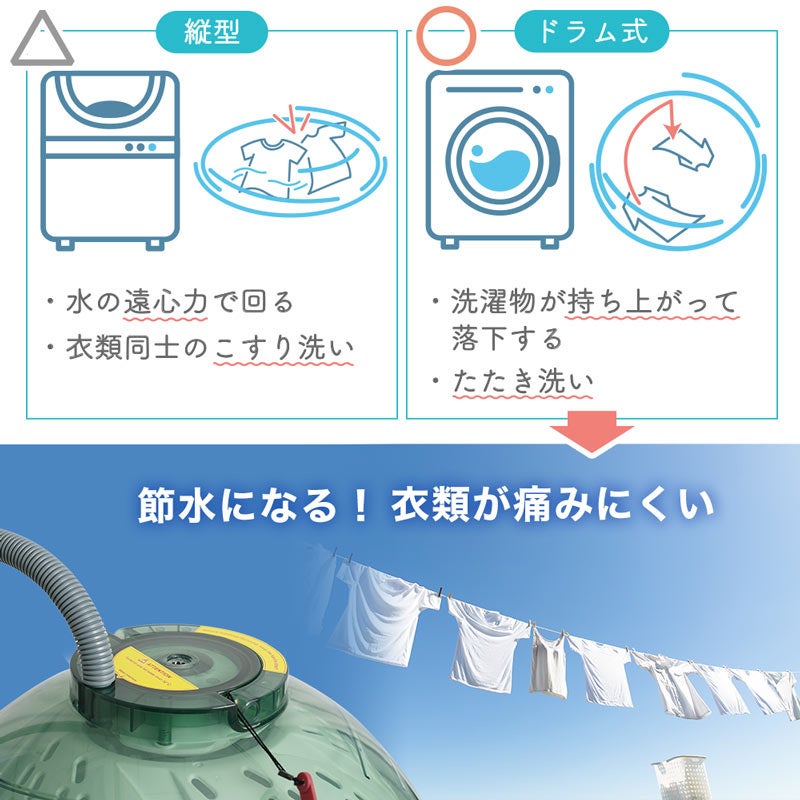 砂やドロだらけの洗濯物を別で洗いたい。ペットの毛がたくさんついたものを洗いたい。アウトドアや災害時に電気が無い所で洗濯をしたい。 そんな方におすすめの ドラム式全手動洗濯機「ぐるぐるぶんまわ槽ball」です。