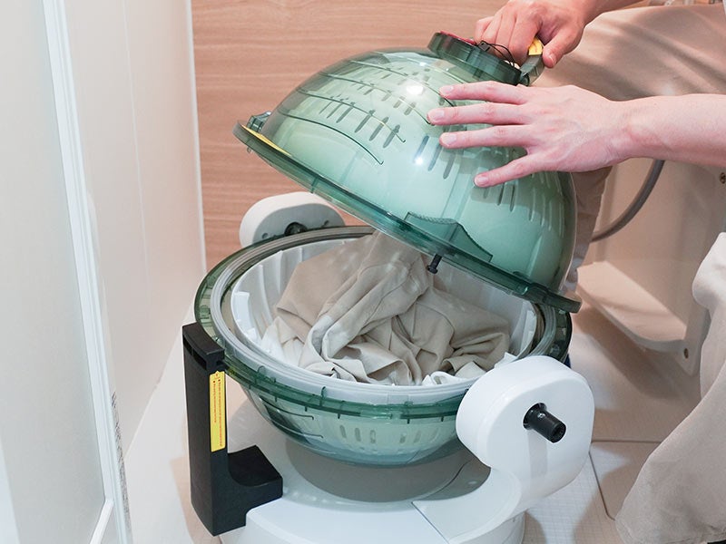 洗濯容量3kgまで対応。球体の下半球の洗濯槽に洗濯物、洗剤を入れて上半球をセット、給水ホースから水を投入すればOK。水は直接洗濯槽に入れることも可能です。