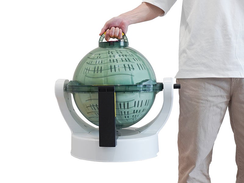 電気を使わず洗濯から脱水までできるボール形状のドラム式手動洗濯機