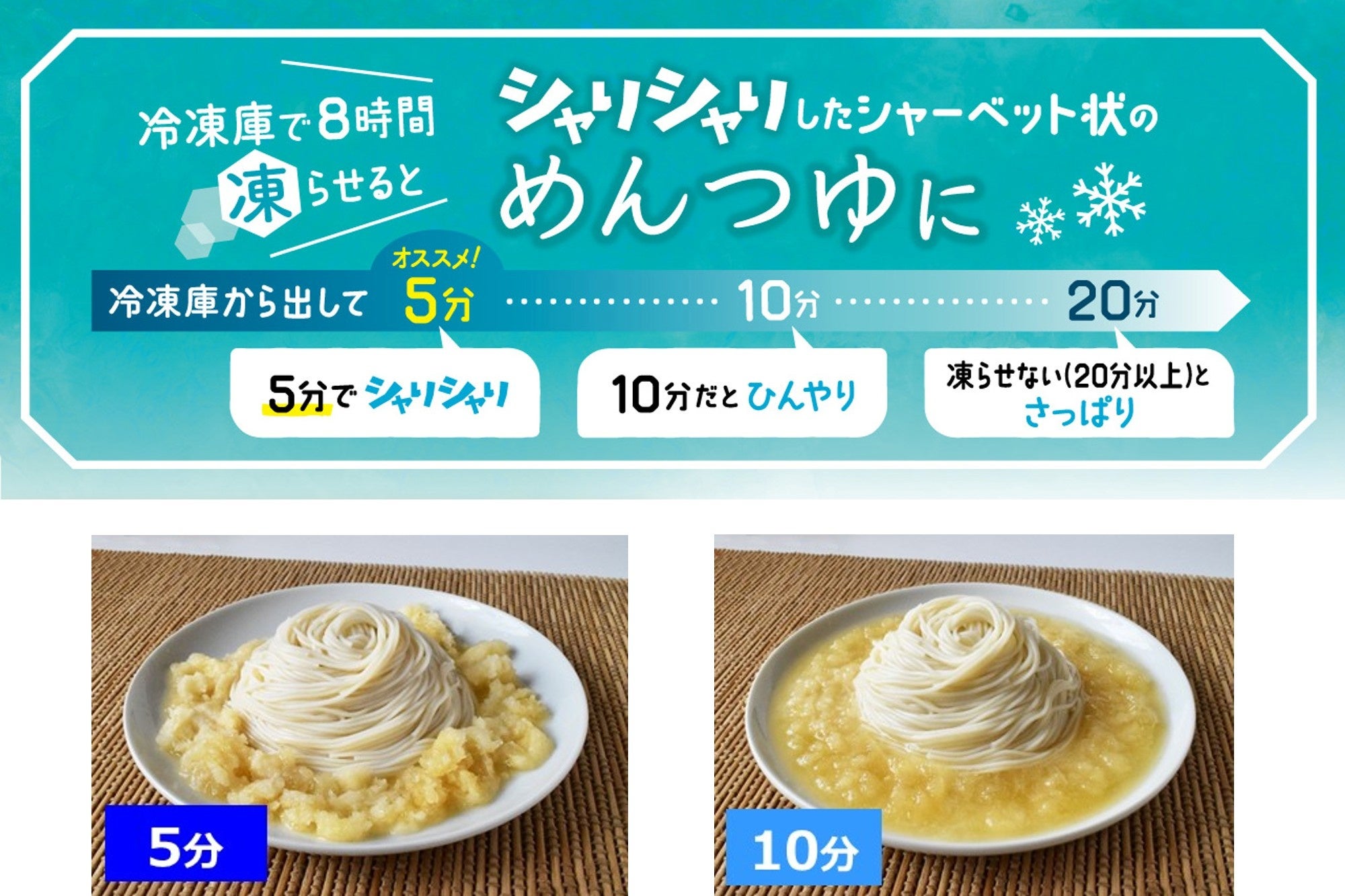 つゆを冷凍庫で8時間凍らせるだけで、シャリシャリとした食感の冷やそうめんつゆが完成します。氷の結晶のサイズにこだわった、家ではなかなかつくれない「凍らせるつゆ」を手軽に楽しめます。