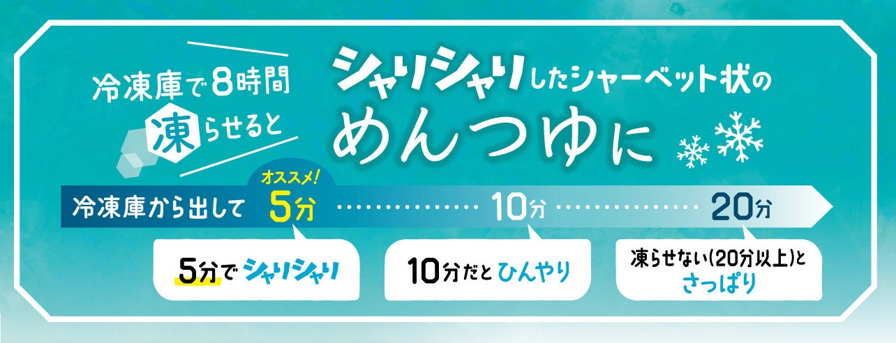 麺を茹でている間に、凍らせた「シャリっと冷やそうめん」を冷凍庫から出して、5分でシャリシャリ、10分でひんやり、20分以上でさっぱりとした冷たい麺が楽しめます。