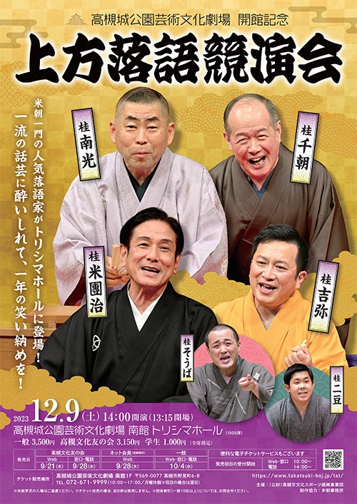 米朝一門の人気落語家が一堂に会する落語会を12月9日(土曜日)に高槻城公園芸術文化劇場で開催。一流の話芸が観客の皆さまを魅了します。