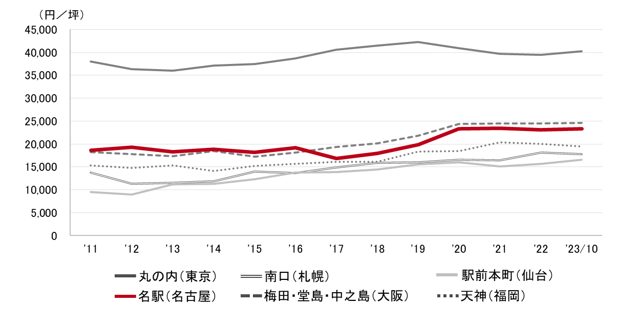高価格帯のビルではリーシング活動に時間を要する傾向が見られる一方、賃貸条件の見直しを行ったビルでは比較的大口の成約も散見される。経済活動の活発化に伴って、大口の面積帯でも移転に向けた動きが出始めている。各種条件と賃料水準のバランスが良好なビルはテナントの引き合いを集めやすいとみられ、今後もこの傾向が続くと考えられる。(名古屋支店長 妹尾哲也)