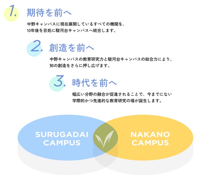 そして、本計画は、現在中野キャンパスに配置されている全機関が約10年後に駿河台キャンパスに統合されることを前提とした計画です。これは、「SURUGADAI 6.0」を実現するためには、中野キャンパスの教育研究力を、駿河台キャンパスの諸機関と連携させることが必要であるとの考え方によるものです。この統合により、教育研究の多分野の融合が促進され、より学際的で先進的な教育研究が駿河台キャンパスで展開されることとなります。なお、統合した後の中野キャンパスの利用については、社会における大学へのニーズなども考慮して理事会においてこれから検討することになります。