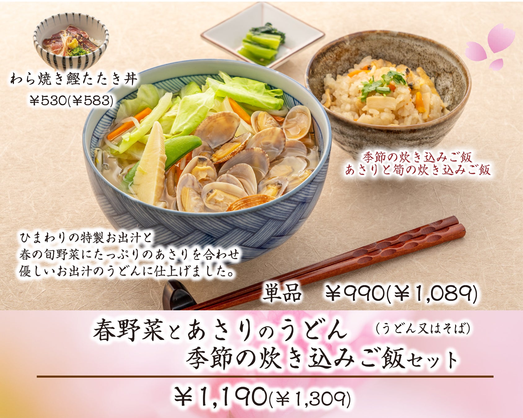 ● 春野菜とあさりのうどん 季節の炊き込みご飯セット 1,190円(税込み1,309円)